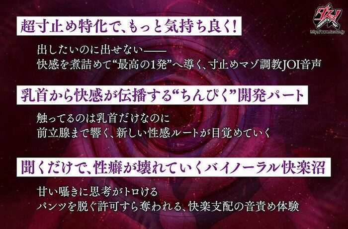 ■第3層「シコシコ寸止め&カウントダウン地獄」(56:04) 「10……9……」とカウントされ、絶頂の淵まで追い詰められては、0の直前で奪われる。 寸止め、寸止め、寸止め。脳の血管が千切れるほどの、もどかしい快楽。